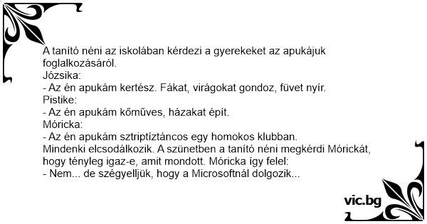 Mindenki elcsodálkozik. A szünetben a tanító néni megkérdi Mórickát, hogy tényleg igaz-e, amit mondott. Móricka így felel: