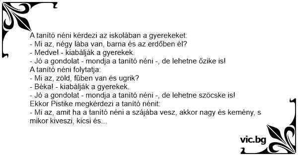 - Jó a gondolat - mondja a tanító néni -, de lehetne szöcske is!