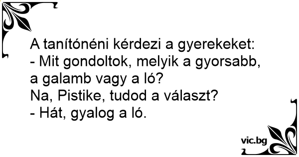 A tanítónéni kérdezi a gyerekeket:<br />- Mit gondoltok, melyik a gyorsabb, a galamb vagy a ló?<br />Na, Pistike, tudod a választ?<br />- Hát, gyalog a ló.