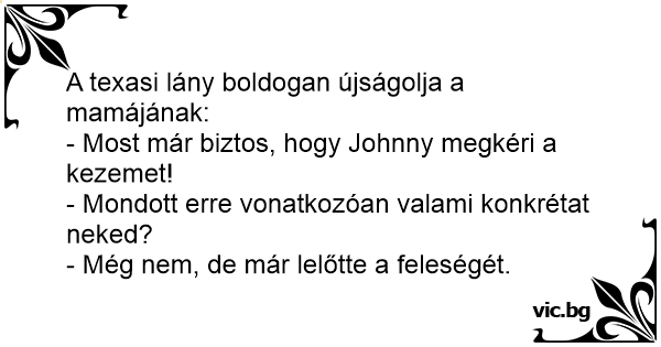 Момиче от Тексас радостно казва на майка си: - Сега е сигурно, че Джони ще поиска ръката ми! - Той каза ли ти нещо конкретно по този въпрос? - Още не, но вече застреля жена си.