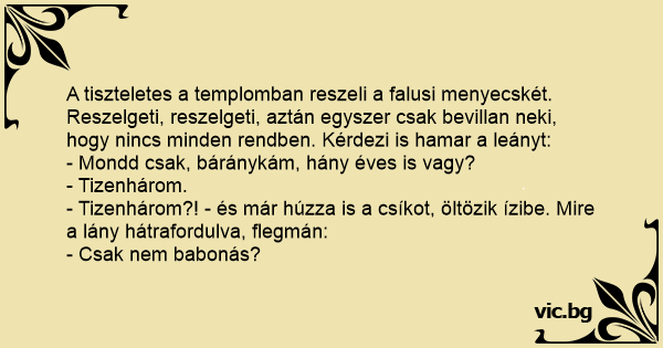 A tiszteletes a templomban reszeli a falusi menyecskét. Reszelgeti, reszelgeti, aztán egyszer csak bevillan neki, hogy nincs minden rendben. Kérdezi is hamar a leányt: - Mondd csak, báránykám, hány éves is vagy? - Tizenhárom. - Tizenhárom?! - és már húzza is a csíkot, öltözik ízibe. Mire a lány hátrafordulva, flegmán: - Csak nem babonás?