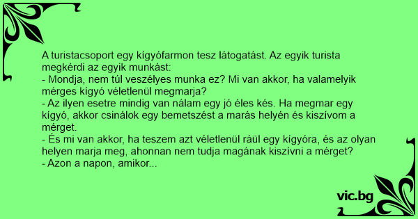 A turistacsoport egy kígyófarmon tesz látogatást. Az egyik turista megkérdi az egyik munkást: