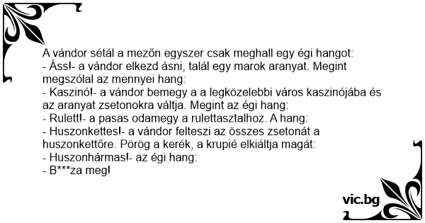- Kaszinó!- a vándor bemegy a a legközelebbi város kaszinójába és az aranyat zsetonokra váltja. Megint az égi hang: