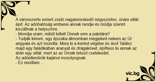 - Tudják kérem, egy éjszaka álmomban megjelent nekem az Úr angyala és azt mondta: Menj ki a kerted végébe és áss! Találsz majd egy faládikában aranyat és drágakövet, építtess te annak az árán egy villát, mert az az Úrnak tetsző cselekedet.
