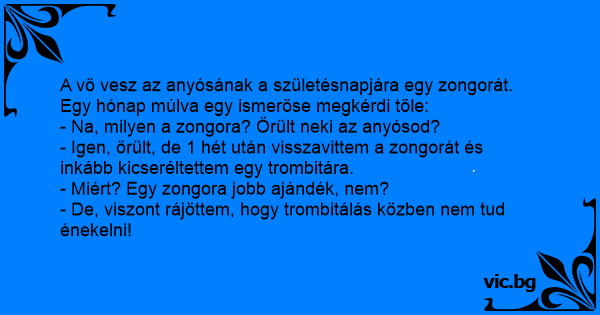 A vő vesz az anyósának a születésnapjára egy zongorát. Egy hónap múlva egy ismerőse megkérdi tőle: