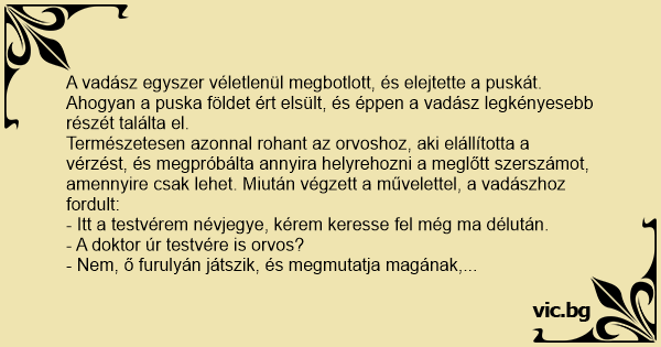 A vadász egyszer véletlenül megbotlott, és elejtette a puskát. Ahogyan a puska földet ért elsült, és éppen a vadász legkényesebb részét találta el.