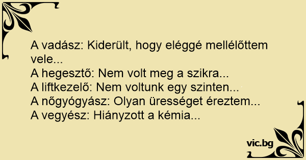 A vadász: Kiderült, hogy eléggé mellélőttem vele... A hegesztő: Nem volt meg a szikra... A liftkezelő: Nem voltunk egy szinten... A nőgyógyász: Olyan ürességet éreztem... A vegyész: Hiányzott a kémia...
