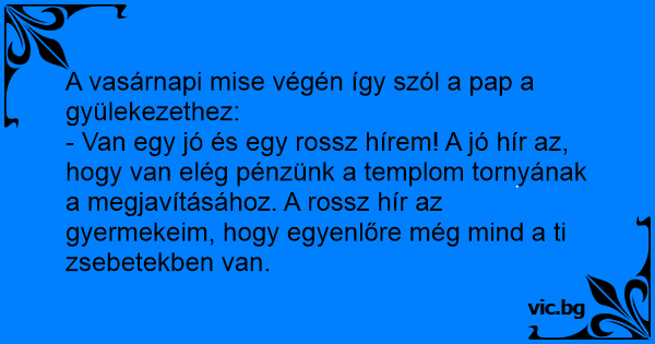 A falusi lelkész így kezdi az istentiszteletet: - Kedves híveim! Van egy jó és egy rossz hírem! A jó hír az, hogy van elég pénzünk arra, hogy felújítsuk templomunkat! A rossz hír az, hogy ez a pénz... Селският поп започва службата: - Скъпи миряни! Имам добра и лоша новина! Добрата новина е, че вече имаме достатъчно пари, за да обновим църквата си! Лошата е, че тези пари все още са в джобовете ви. Kunigas kreipiasi į maldininkus: - Turiu gerą ir blogą naujieną! Geroji – mes turime pinigų bažnyčios remontui. Blogoji – tie pinigai yra vis dar jūsų kišenėse. Священник обращается к пастве: - У меня есть для вас две новости: плохая и хорошая. Хорошая - у нас есть деньги на ремонт церкви! Плохая - эти деньги все еще в ваших кошельках...