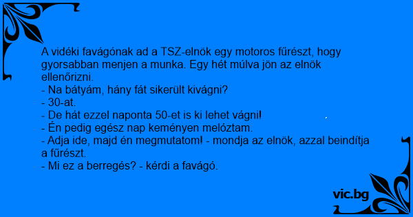 - Adja ide, majd én megmutatom! - mondja az elnök, azzal beindítja a fűrészt.