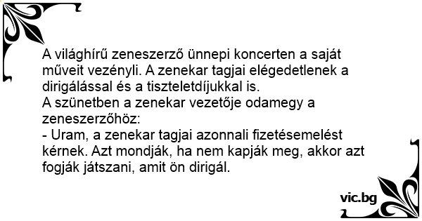 - Uram, a zenekar tagjai azonnali fizetésemelést kérnek. Azt mondják, ha nem kapják meg, akkor azt fogják játszani, amit ön dirigál.