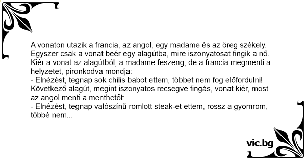 A vonaton utazik a francia, az angol, egy madame és az öreg székely. Egyszer csak a vonat beér egy alagútba, mire iszonyatosat fingik a nő.