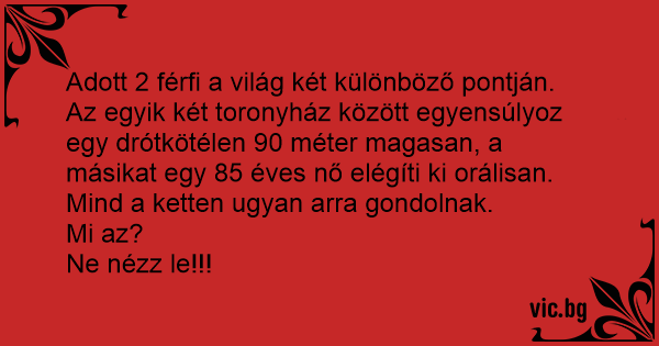 Az egyik két toronyház között egyensúlyoz egy drótkötélen 90 méter magasan, a másikat egy 85 éves nő elégíti ki orálisan. Mind a ketten ugyan arra gondolnak.