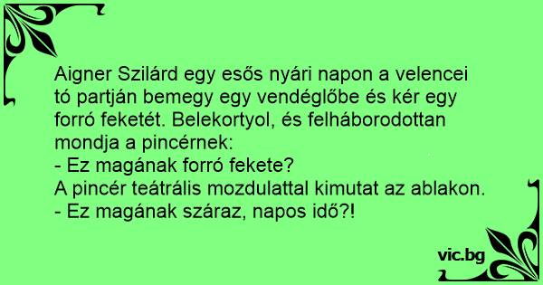 Aigner Szilárd egy esős nyári napon a velencei tó partján bemegy egy vendéglőbe és kér egy forró feketét. Belekortyol, és felháborodottan mondja a pincérnek: