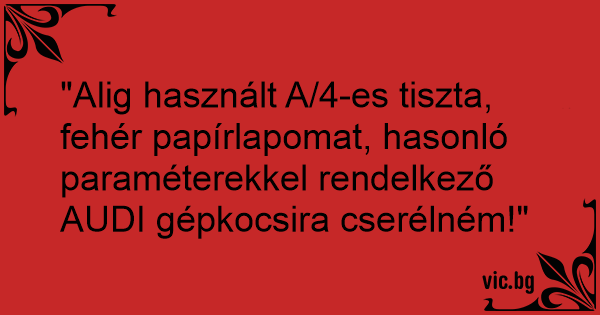 "Alig használt A/4-es tiszta, fehér papírlapomat, hasonló paraméterekkel rendelkező AUDI gépkocsira cserélném!"