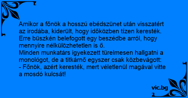 - Főnök, azért keresték, mert véletlenül magával vitte a mosdó kulcsát!