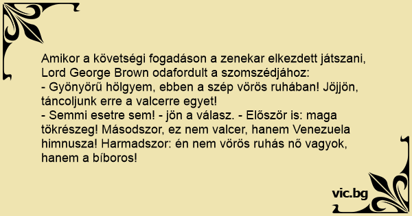 - Semmi esetre sem! - jön a válasz. - Először is: maga tökrészeg! Másodszor, ez nem valcer, hanem Venezuela himnusza! Harmadszor: én nem vörös ruhás nő vagyok, hanem a bíboros!
