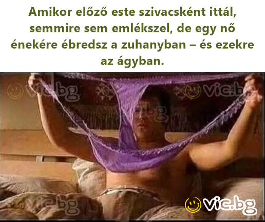 Кога вечерта пред тоа си пиел како сунѓер, не памтиш ништо, ама се будиш со некој женски глас што пее во бањата и овие во креветот.