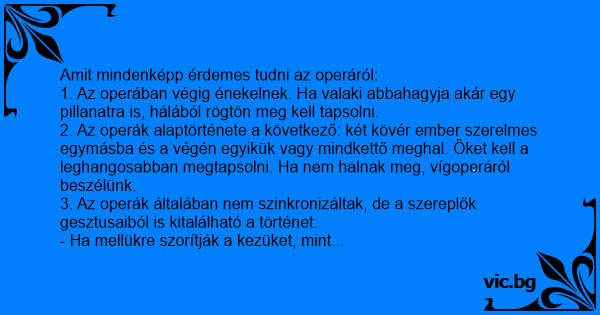 2. Az operák alaptörténete a következő: két kövér ember szerelmes egymásba és a végén egyikük vagy mindkettő meghal. Őket kell a leghangosabban megtapsolni. Ha nem halnak meg, vígoperáról beszélünk.