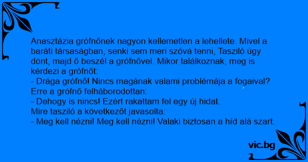Anasztázia grófnőnek nagyon kellemetlen a lehellete. Mivel a baráti társaságban, senki sem meri szóvá tenni, Tasziló úgy dönt, majd ő beszél a grófnővel. Mikor találkoznak, meg is kérdezi a grófnőt: