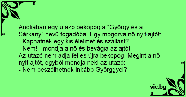 Angliában egy utazó bekopog a "György és a Sárkány" nevű fogadóba. Egy mogorva nő nyit ajtót: