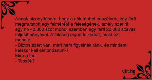 Annak bizonyítására, hogy a nők többet beszélnek, egy férfi megmutatott egy felmérést a feleségének, amely szerint egy nő 40.000 szót mond, szemben egy férfi 20.000 szavas teljesítményével. A feleség elgondolkodott, majd ezt mondta:
