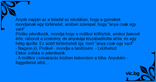 Anyák napján az a feladat az iskolában, hogy a gyerekek mondjanak egy történetet, amiben szerepel, hogy "anya csak egy van!"