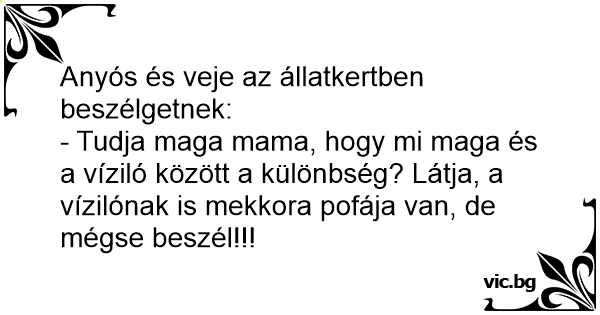 - Tudja maga mama, hogy mi maga és a víziló között a különbség? Látja, a vízilónak is mekkora pofája van, de mégse beszél!!!