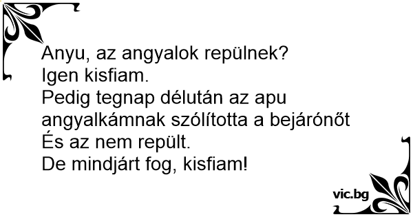 - Anyu, tud a szobalányunk repülni? - Dehogy. Honnan veszed? - Mert tegnap, mikor elmentél itthonról, apu azt mondta neki, hogy ő egy angyal. - Igen? Na, akkor mégis repülni fog!