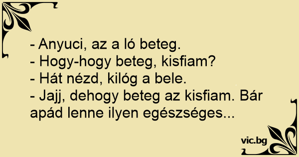 - Anyuci, az a ló beteg. - Hogy-hogy beteg, kisfiam? - Hát nézd, kilóg a bele. - Jajj, dehogy beteg az kisfiam. Bár apád lenne ilyen egészséges...