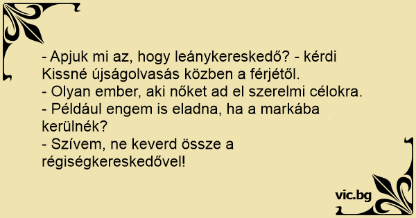 - Apjuk mi az, hogy leánykereskedő? - kérdi Kissné újságolvasás közben a férjétől.
