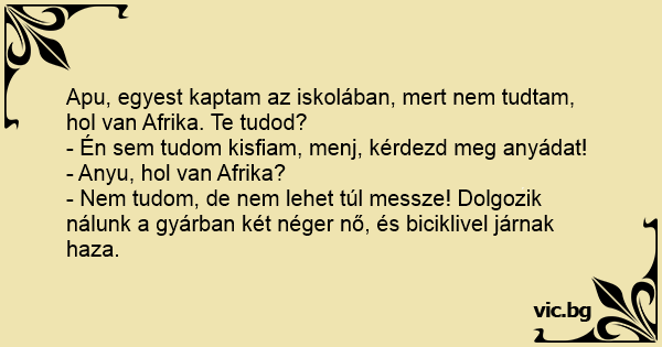 - Te, milyen messze van innen Afrika? - Nem tudom, de nem lehet túl messze, mert a gyárba menet reggel mindig találkozom egy négerrel, és ő biciklin jár.