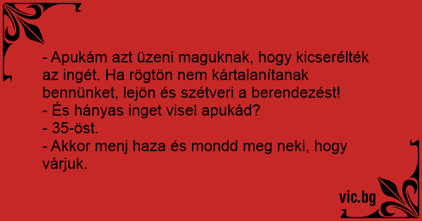 - Apukám azt üzeni maguknak, hogy kicserélték az ingét. Ha rögtön nem kártalanítanak bennünket, lejön és szétveri a berendezést!