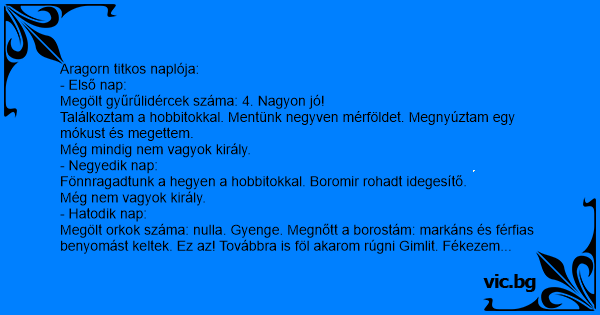 Megölt orkok száma: nulla. Megint nőtt a borostám; elég szőrös vagyok. Legolas azt mondta, hogy egy árnyék és egy fenyegetés növekszik elméjében. Azt hiszem, Legolas valószínűleg buzi.