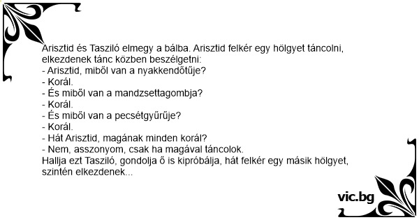 Arisztid és Tasziló elmegy a bálba. Arisztid felkér egy hölgyet táncolni, elkezdenek tánc közben beszélgetni: