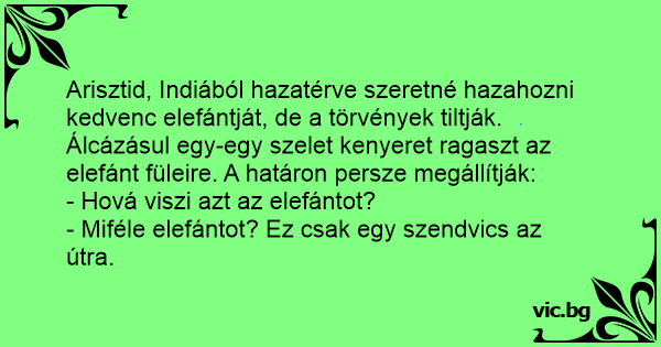 Arisztid, Indiából hazatérve szeretné hazahozni kedvenc elefántját, de a törvények tiltják. Álcázásul egy-egy szelet kenyeret ragaszt az elefánt füleire. A határon persze megállítják: