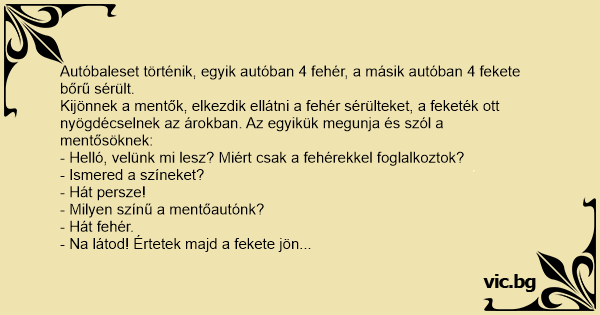 Autóbaleset történik, egyik autóban 4 fehér, a másik autóban 4 fekete bőrű sérült.