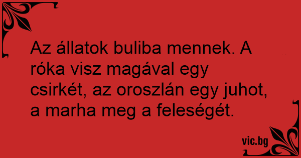 Az állatok buliba mennek. A róka visz magával egy csirkét, az oroszlán egy juhot, a marha meg a feleségét.