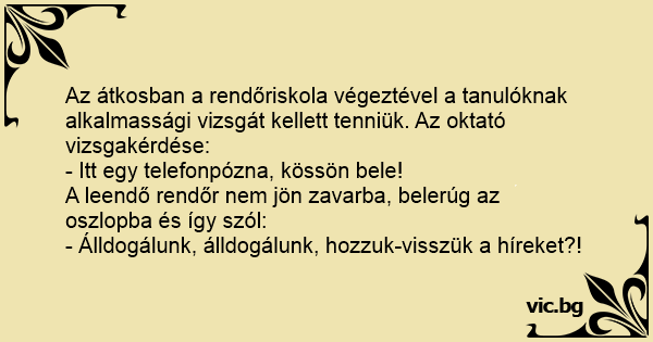 Az átkosban a rendőriskola végeztével a tanulóknak alkalmassági vizsgát kellett tenniük. Az oktató vizsgakérdése: