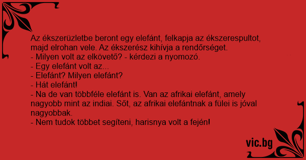 Az ékszerüzletbe beront egy elefánt, felkapja az ékszerespultot, majd elrohan vele. Az ékszerész kihívja a rendőrséget.