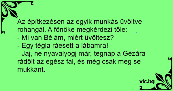 - Jaj, ne nyavalyogj már, tegnap a Gézára rádőlt az egész fal, és még csak meg se mukkant.
