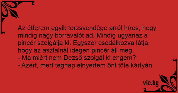 Az étterem egyik törzsvendége arról híres, hogy mindig nagy borravalót ad. Mindig ugyanaz a pincér szolgálja ki. Egyszer csodálkozva látja, hogy az asztalnál idegen pincér áll meg.