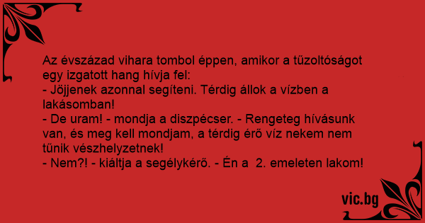 - De uram! - mondja a diszpécser. - Rengeteg hívásunk van, és meg kell mondjam, a térdig érő víz nekem nem tűnik vészhelyzetnek!