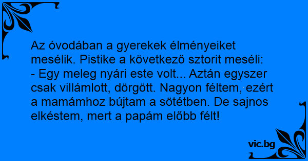 Az óvodában a gyerekek élményeiket mesélik. Pistike a következő sztorit meséli: