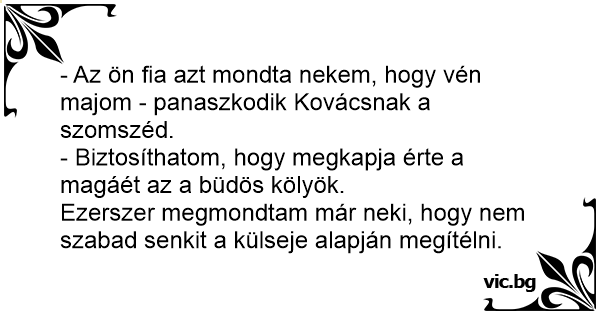 - Az ön fia azt mondta nekem, hogy vén majom - panaszkodik Kovácsnak a szomszéd.