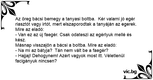 Az öreg bácsi bemegy a tanyasi boltba. Kér valami jó egér riasztót vagy irtót, mert elszaporodtak a tanyáján az egerek.