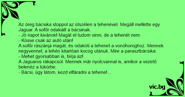 Az öreg bácsika stoppol az útszélen a tehenével. Megáll mellette egy Jaguar. A sofőr odakiált a bácsinak.