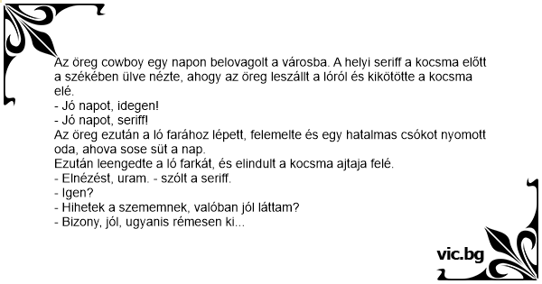 Az öreg cowboy egy napon belovagolt a városba. A helyi seriff a kocsma előtt a székében ülve nézte, ahogy az öreg leszállt a lóról és kikötötte a kocsma elé.