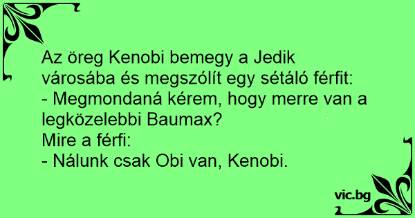 Az öreg Kenobi bemegy a Jedik városába és megszólít egy sétáló férfit: - Megmondaná kérem, hogy merre van a legközelebbi Baumax? Mire a férfi: - Nálunk csak Obi van, Kenobi.