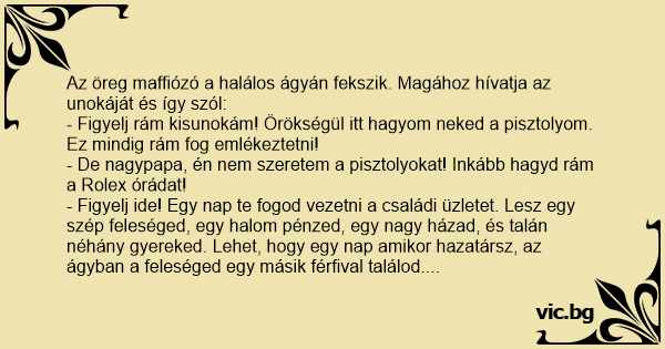 Az öreg maffiózó a halálos ágyán fekszik. Magához hívatja az unokáját és így szól: