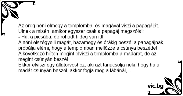 Következő héten megint bemennek a templomba. A pap éppen a mise közepén таrт, amikor a papagáj megszólal: